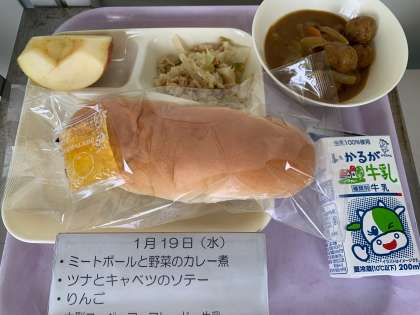 パン・牛乳・マーマレード・ミートボールと野菜のカレー・ツナとキャベツのソテー・りんご