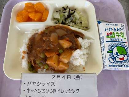 ごはん・牛乳・ハヤシライス・キャベツのひじきドレッシング・みかん(缶)