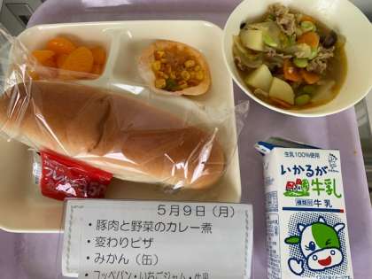 パン・牛乳・いちごジャム・豚肉と野菜のカレースープ煮、変わりピザ、みかん(缶)