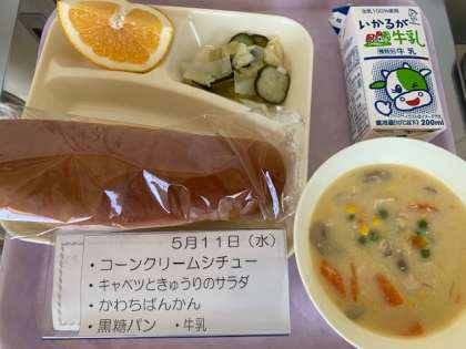 パン・牛乳・コーンクリームシチュー・キャベツときゅうりのサラダ・かわちばんかん