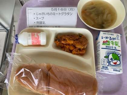 パン・牛乳・じゃがいものミートグラタン・スープ・発酵乳