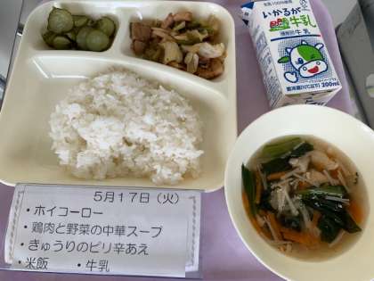 ごはん・牛乳・ホイコウロー・鶏肉と野菜の中華スープ・きゅりのピリ辛あえ