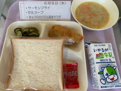 パン・牛乳・サーモンフライ・豆乳スープ・きゅうりのバジル風味サラダ・いちごジャム
