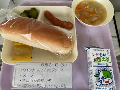 パン・牛乳・アプリコットジャム・ウインナーのケチャップソース・スープ・きゅうりのサラダ