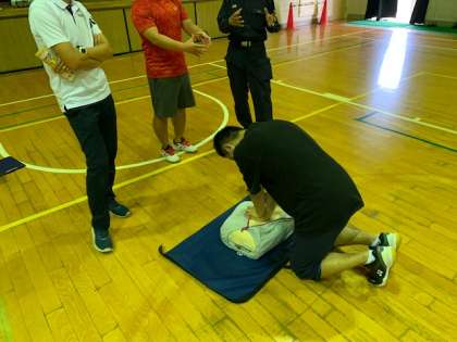 教職員を対象に胸部圧迫や人口呼吸、AEDの使用など緊急時に対応できるように研修を行いました。講師を西淀川消防署より来ていただき、熱心に研修をしていただきました。