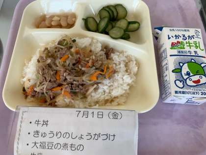 ごはん・牛乳・牛丼・きゅうりのしょうがづけ・大福豆の煮もの