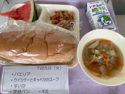 パン・牛乳・パエリア・ウインナーとキャベツのスープ・すいか