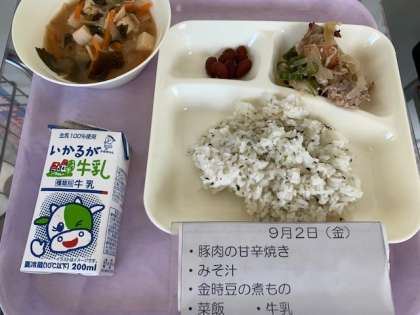 菜叛・牛乳・豚肉の甘辛焼き・みそ汁・金時豆の煮もの