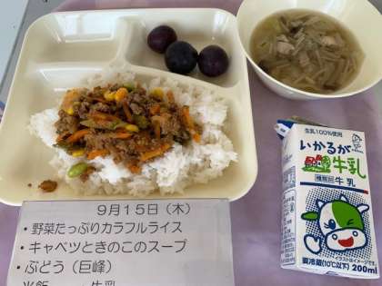 ごはん・牛乳・野菜たっぷりカラフルライス・キャベツときのこのスープ・ブドウ(巨峰)