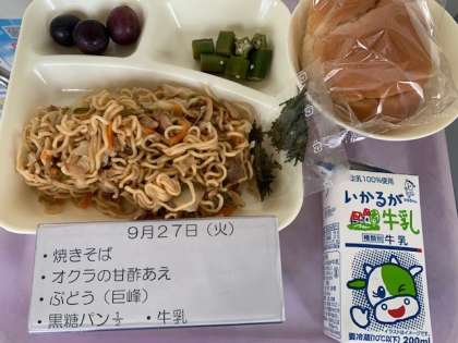 焼きそば・オクラの甘酢あえ・ぶどう(巨峰)・黒糖パン・牛乳