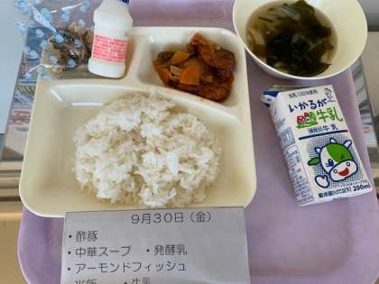 ごはん・牛乳・酢豚・中華スープ・アーモンドフィッシュ・発酵乳