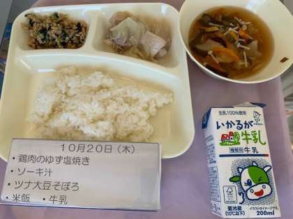 ごはん・牛乳・鶏肉のゆず塩焼き・ソーキ汁・ツナ大豆そぼろ