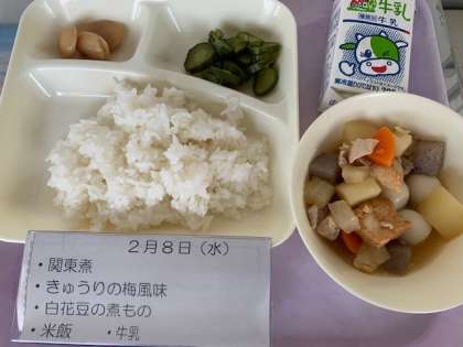 ごはん・牛乳・関東煮・きゅうりの梅風味・白花豆の煮もの