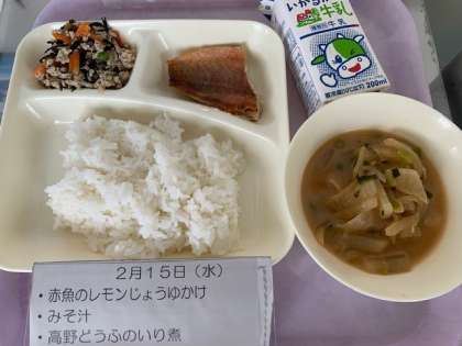 ごはん・牛乳・あかうおのレモンじょうゆかけ・みそ汁・高野どうふのいり煮
