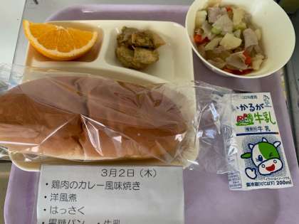 パン・牛乳・鶏肉のカレー風味焼き・洋風煮・はっさく