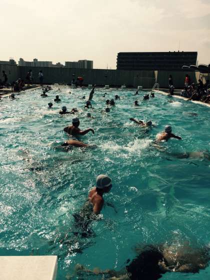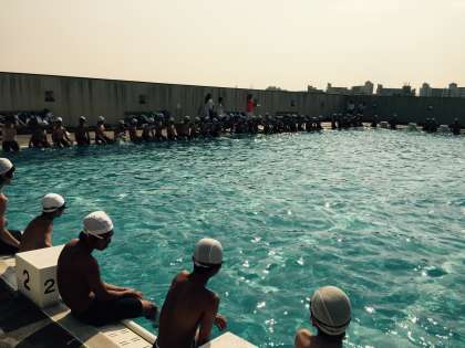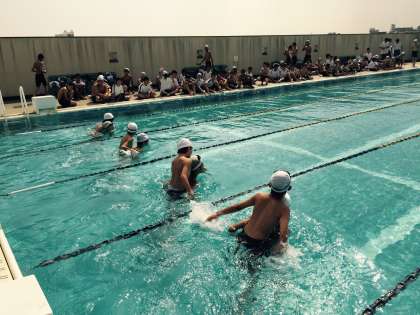 競技は、自由形、平泳ぎ、ビート板、おんぶ競争、100mリレー、男女混合200mリレー、ボール競争、碁石拾いを行いました。