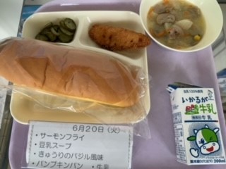 パン・牛乳・サーモンフライ・豆乳スープ・きゅうりのバジル風味サラダ