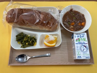 今日の給食は ビーフシチュー さんど豆とコーンのサラダ あまなつ柑 おさつパン 牛乳 の献立。しっかりと食べ応えがありました。それにしても、こうして写真でみてもパンのサイズが大きい。さすが食べざかりの中学生の給食です。