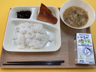 5月はじめの給食は 赤魚のしょうゆだれかけ 豚汁 ひじきの炒め煮 ご飯 牛乳 の献立でした。これぞ和食という献立で、ほっこりと和みました。