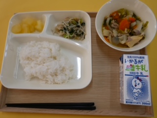 今日の給食は 中華煮 チンゲンサイとモヤシの生姜和え リンゴのカット缶 ご飯 牛乳 の献立でした。給食の煮物系はいつも具だくさんで驚かされますが、今日もまた満足です。豚肉、キャベツ、タマネギ、タケノコ、ニンジン、ニラ。それも一切れずつという状態ではありません。写真をご覧ください。ありがたいことだなと思います。今日もごちそうさまでした。