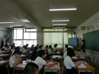 2年生の英語の授業のようすです。先生の流暢な発音に続き、子どもたちもカッコよく英語の発声をしていました。おや?この授業には先生がたくさんいます。主になる英語の先生、チームティーチングをおこなう英語の先生、そして、本校に常駐する学力向上支援コラボレーターの先生、さらに、1ヶ月に1度程度の巡回で来校する学力向上支援チーフコラボレーターという大阪市教育委員会の先生です。淀中学校に限らず、多くの大阪市の中学校では、国語、数学、英語で「個に応じた学習指導」を進めるために数名多くの教員が配置されています。そして、淀中学校は大阪市教育委員会から学力向上の重点的な支援を得る学校ですので、前述のコラボレーターの先生たちが学力向上のための支援活動をおこなっているということになります。そんな一面をご紹介します。