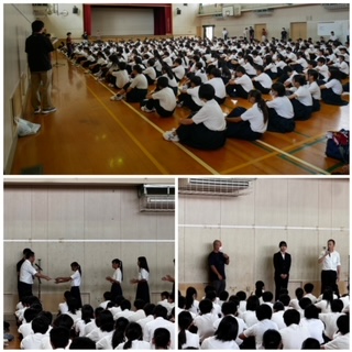今週もはじめに表彰から。今週は水泳部が大阪市の大会であげたたくさんの成果を表彰しました。毎週のようにたたえられる成果があるのはすごいことです。みんなの頑張りに拍手です。