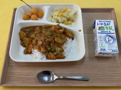 今日の給食は チキンカレーライス キャベツとコーンのサラダ さくらんぼ(缶) 牛乳 の献立です。美味しくいただき、さあ、今週も頑張りましょう。子どもたち、たくさん食べるんだぞ。