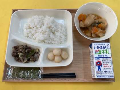 昨日、給食の行事献立をアップできませんでしたので1日遅れにはなりますがご紹介します。昨日は「月見の行事献立」で、一口がんもと芋のみそ煮 牛肉と野菜の炒め物 みたらし団子 焼きのり ご飯 牛乳 の献立でした。