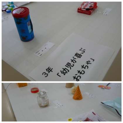 家庭科の作品は1年生の「刺し子」、2年生の「ティッシュカバー」、3年生の「幼児のおもちゃ」です。細やかに仕上げられていました。小さい子がきっと喜んで遊ぶだろうなと思いました。