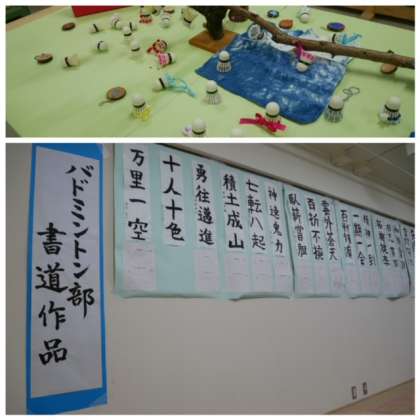 科学技術部の展示ではさまざまな面白い実験についての展示がありました。写真に写っていないものも多数。やってみたくなりました。サポートルームの作品は細かく手をかけてつくられています。根気強く頑張っているようすを思い浮かべました。バドミントン部も展示作品を出品しています。書道にリサイクル作品に活動新聞。運動部ならではの言葉を書道にしたためていました。