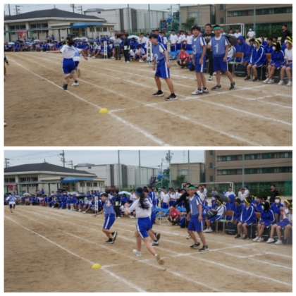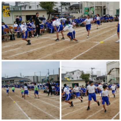 さあ、ここからは体育大会の華。リレー競技です。どのリレーも各学級で手をあげたやる気みなぎる子どもたち。バトンをつなぎます。応援もきっと熱が入るまず、まず全学年女子の半周リレー。続いて全学年男女の男女混合リレー。全学年男子の1周リレー。最後はグループ対抗リレーです。どのリレーも力走につぐ力走。スムーズなバトンパスもあれば、勢いあまってバトンを落としてしまったり転倒してしまったりも。頑張る姿が胸を打ちます。どの子もドキドキとした鼓動がきこえてきそうです。頑張れ!思わず声を出して応援です。会場の熱気がすごいです。