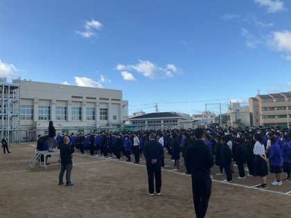 気持ちの良い秋空のもと、月曜日、朝の全校集会を行いました。今週は急に寒くなるということなので体調を崩さないようにみんなで気をつけたいです。