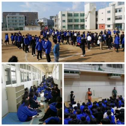 今日は南海トラフ大地震と大津波の襲来を想定しての避難訓練を全校で行いました。しっかりとした態度で訓練ができて良かったと思います。南海トラフ大地震が発生したら、大阪でも震度6の揺れが予想されています。約2時間後に最大7mの津波の襲来可能性があるとも予想されています。日頃から正しい知識を身につけて地震が起きた時の行動をイメージしておかなければ。人間に自然災害に立ち向かう力はないですが、みんなで何とか生き残りたいです。そして、お年寄りや小さな子を助ける頼もしい地域の中学生でいてほしいです。