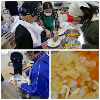 淀中学校には外国につながりのあるたくさんの生徒がいて、母国語や母国文化にふれる教室を放課後に開いています。今日は今年度最後のフィリピン教室。講師先生のご指導でフィリピンのデザートをつくりました。フルーツを刻み、生クリームを泡立てます。たっぷりのフルーツがぜいたくです。話をきいて、たくさんの先生が調理室に集まってきて賑やかです。楽しいひと時を過ごすことができました。