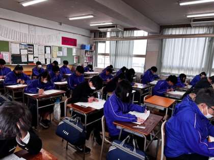 1年生、2年生が学年末テストを頑張っています。写真は2年生の様子。あと少しで3年生に進級し受験生となる2年生。やるべき時にしっかりと勉強を頑張る姿勢を身につけて3年生になってほしいです。応援しています。