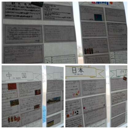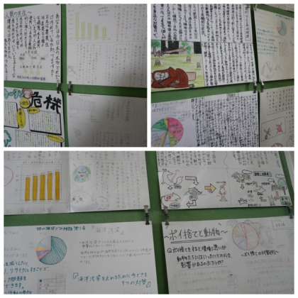 先日の参観日に合わせて廊下に1年生と2年生の教科横断的な学習で取り組んでまとめた掲示物があったのですがご覧いただけたでしょうか。1年生は世界のさまざまな国の文化について調べまとめたもの、2年生は地球環境問題について調べまとめたものです。書物だけではなく1人1台PCを自在に活用して調べまとめてプレゼンテーションをする。ディスカッションして考えを広げ深める。これから当たり前のようになっていく学習のスタイルです。1年生の掲示物も2年生の掲示物もあらためて読んでみるととても読み応えがありました。このようにまとめられたことを自信に思ってほしいです。