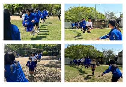 練習の甲斐あってか、ついにみんなで跳べる時が!どのクラスも、何度か成功。通算何回跳べたかで勝敗が決まるとのこと。