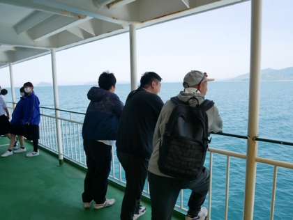 唐津から壱岐まで、しばし船旅です。天気が良いのでデッキに出ています。想像していたより速い。心地よい海風にふかれながら船旅を満喫しています。先生たちも海を見つめながら旅情を深めています。心に何を思っているのか。