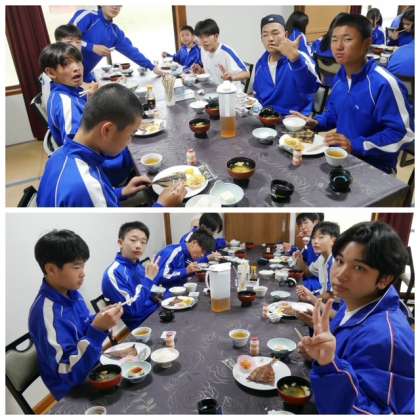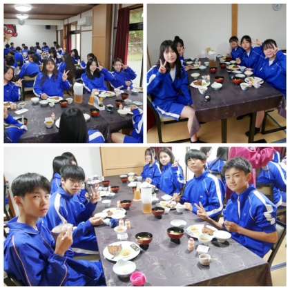 皆さん、おはようございます。怪我をしたり大きく体調を崩したりすることなく、修学旅行2日目の朝を迎えました。朝食は、「ザ 日本の宿の朝食」という感じです。とうふ、アジのみりん干し、みそ汁、きんぴらごぼう、納豆、たくあん、ご飯、発酵乳 です。