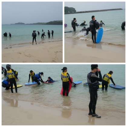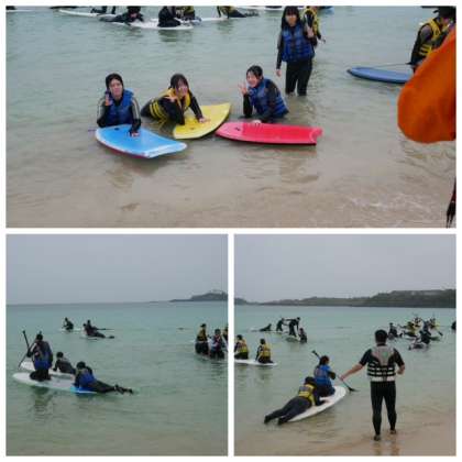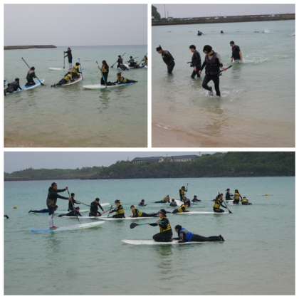天気が悪いため、沖合にはいかず、ビーチ近辺での体験活動です。寒いです。カッパを着てカメラを持って浜辺をウロウロとしていると震えがきました。そてでもウェットスーツを着込んで海に飛び込んだ子どもたちは寒そうなようすもなく元気いっぱいです。どうなんだろう‥逆に海の中は温かいのかな‥。もはや4つの活動が入り乱れてのカオス状態ですが、それでもよく見ていると、パドルボードとボディボードはずいぶんと上達しているように思いました。よーし、たくさんエネルギーを発散しよう。クタクタになるまで遊びまくれ。‥そして、今晩はこてんと寝ようね。