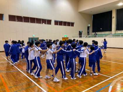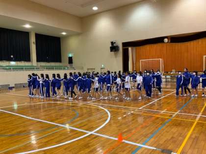 最後の競技はジャンケン列車です。さあ、最後に勝ち残れるのは誰かな。学年みんなでやったから、長い長い列車が出来あがりました。良かったよかった。楽しかった。総合得点では‥準優勝は(ドラムロール)2組。優勝は(ドラムロール)1組。おめでとうございます。