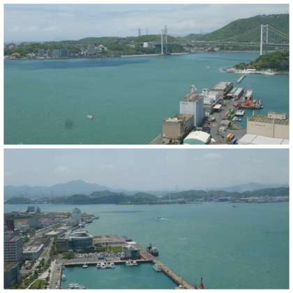 お金がかかるので上がってくるグループはいるかなあと思いながら配置場所の展望室に上がってきました。おおっ、目の前に本州と九州の境目の関門海峡が。なかなか見応えあるぞ。そうこうしているうちに何人か上がってきてくれました。よかったです。