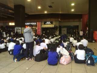 雨の中ですが、元気に出発します。 校長先生、修学旅行実行委員長のあいさつの後、新幹線に乗り込みます。
