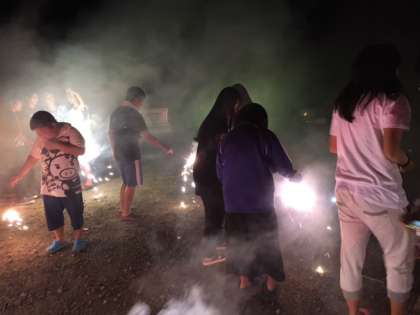 室内でのゲームの後、宿舎の前で花火をしました。ワイワイキャーキャーと楽しいひと時でした。