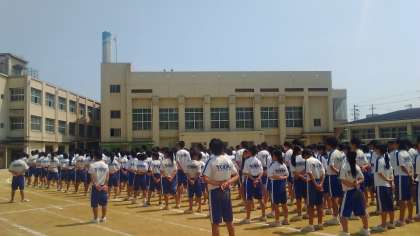 暑い中、行進や校歌の練習などをしています。