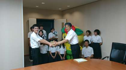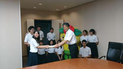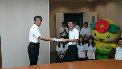 1学期に行った、熊本支援募金と応援メッセージを書いた色紙を西淀川区の塩屋区長さんに直接手渡しました。