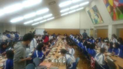 これから、夕食を食べます。おなかペコペコで待ちきれません。班ごとにそろって食べます。いただきます。