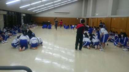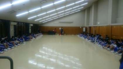 レクリエーションが始まりました。こちらも、クラス対抗で競います。応援にも熱が入っています。今は、紙タワーに挑戦中です。
