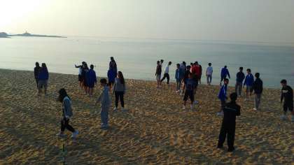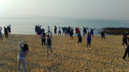 海をバックにラジオ体操。