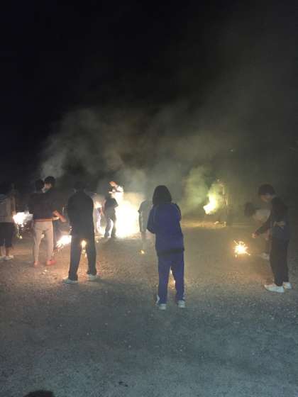 班ごとに肝試しに行ったあと、宿舎前で花火をしています。